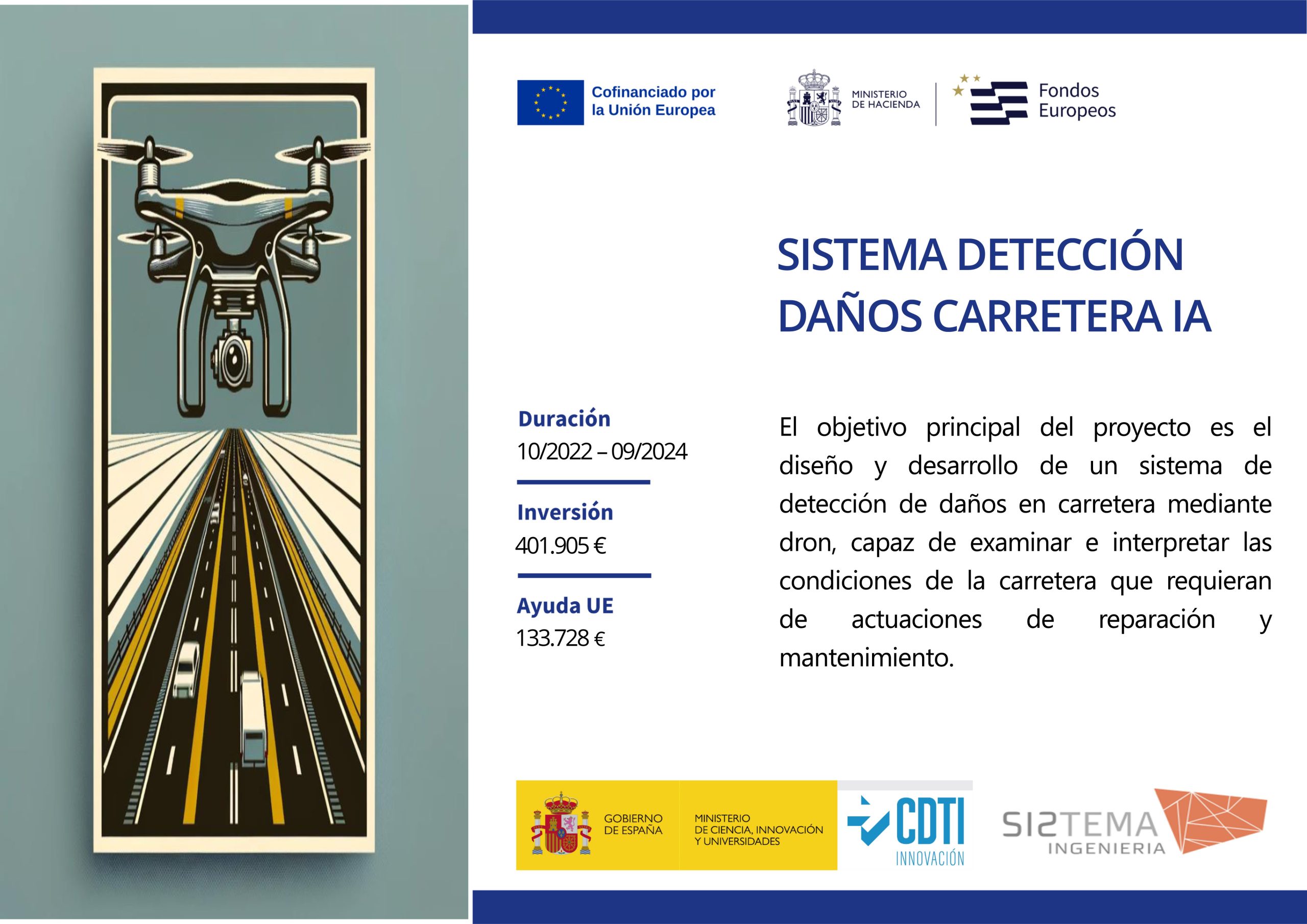 El objetivo del proyecto plantea un sistema de inspección con dron que, mediante inteligencia artificial, detecte y localice (por tramos y posición) las patologías del firme para planificar reparaciones y mantenimiento de forma más segura, económica, rápida y con menor impacto.